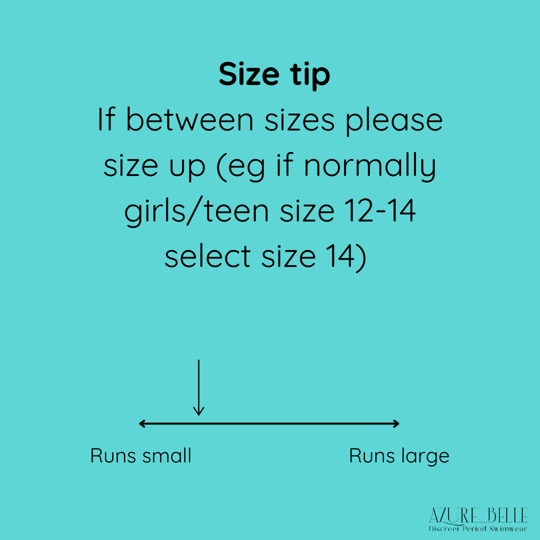 Sizing tip: Select the underwear size you or your teen normally wears. If between sizes or tall, size up (eg; if normally 12-14, select a size 14). Ensure you have a tight but comfortable fit.