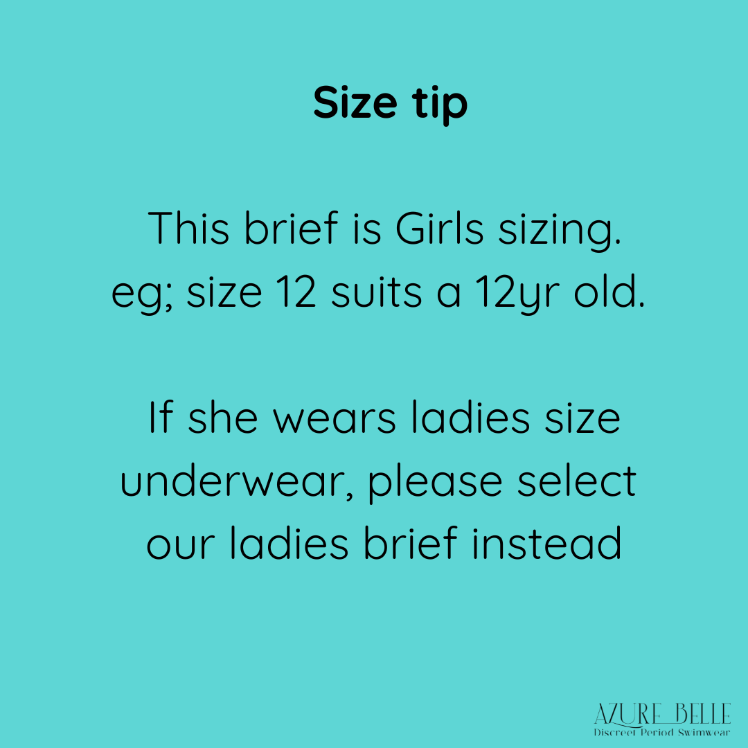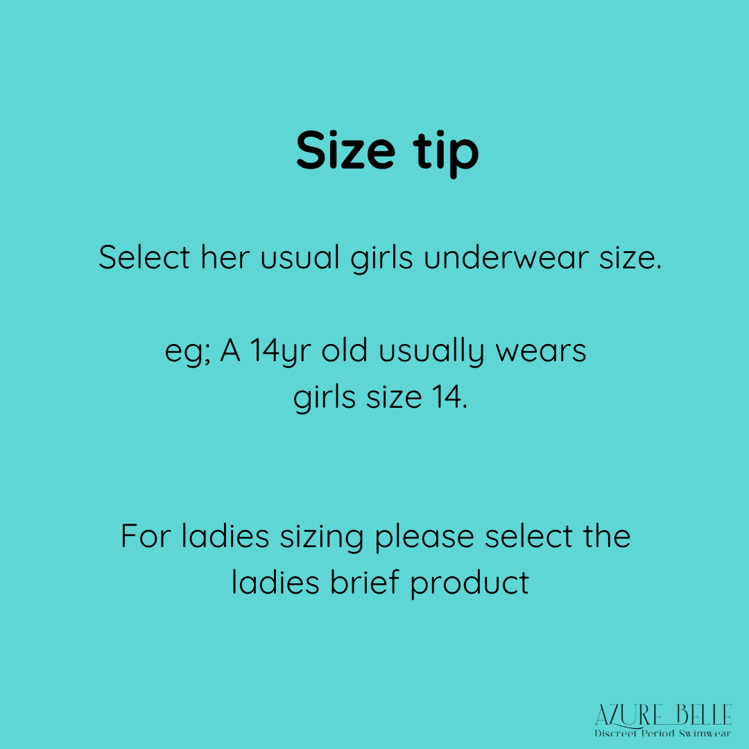 Teen sizing tip: Choose her usual girls underwear size. If she's between sizes, size up (e.g. if she's usually a size 12–14, select 14). If she wears ladies sizing, please select our ladies size brief
